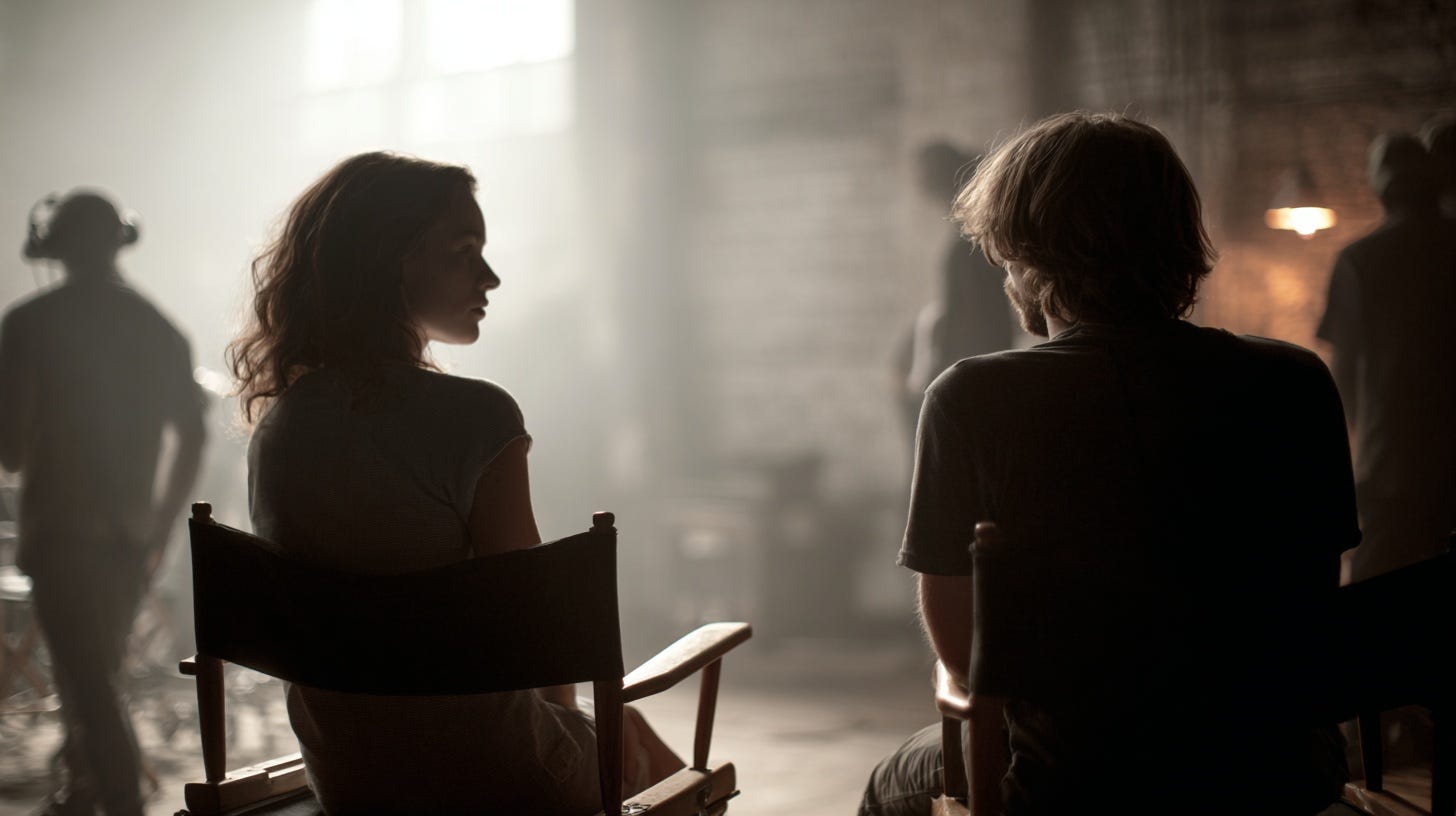 “Due persone, una donna e un uomo, visti di spalle e di profilo, su un set cinematografico”