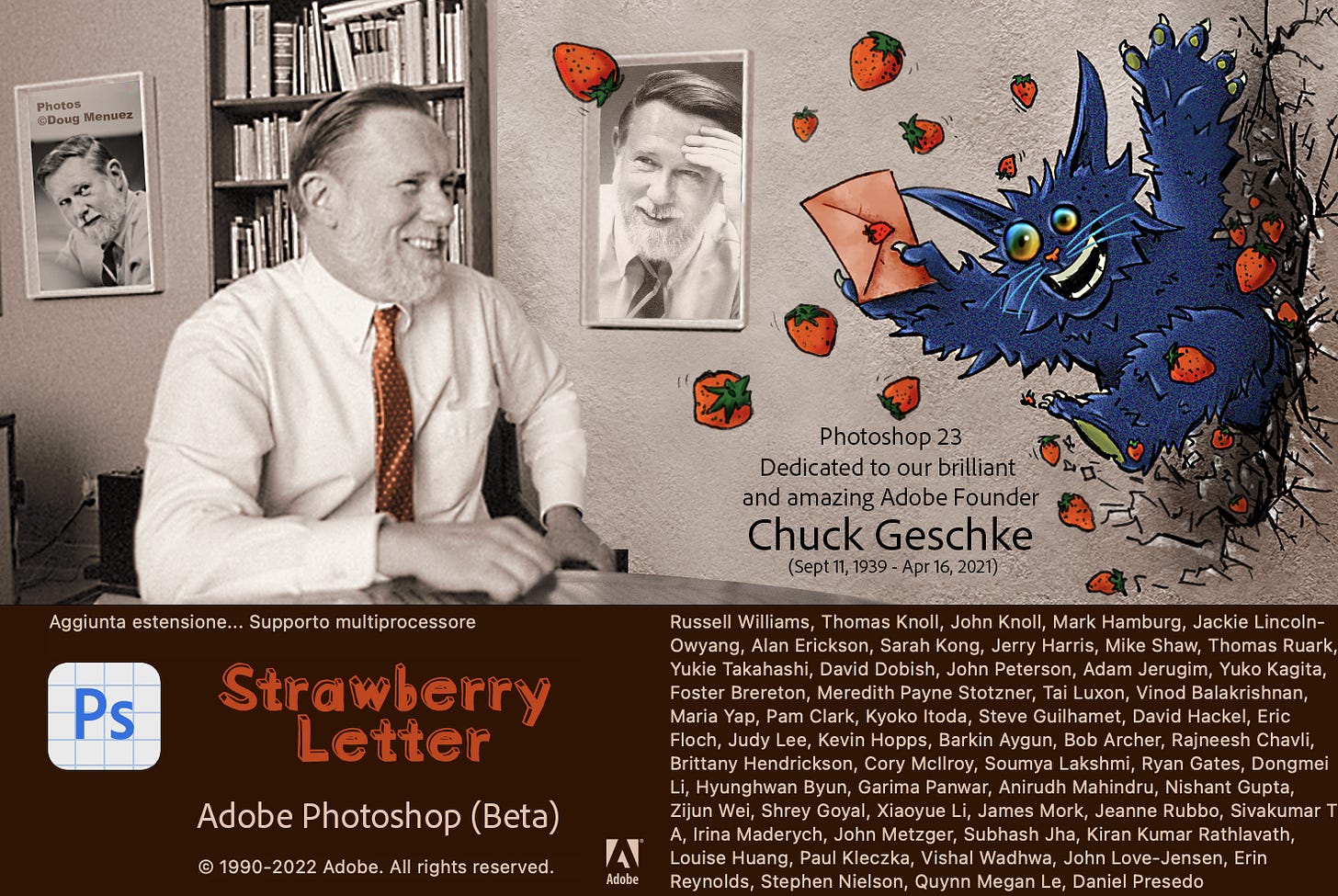 Omaggio a Chuck: la versione beta di Photoshop, nel suo screen di partenza, rende omaggio a Chuck Geschke, uno dei fondatori, venuto a mancare circa un anno fa. Ci uniamo all’omaggio, visto che quella data di nascita che si legge nel copyright del prodotto (1990) ci vedeva già utenti di Photoshop… bei tempi, grazie Chuck.